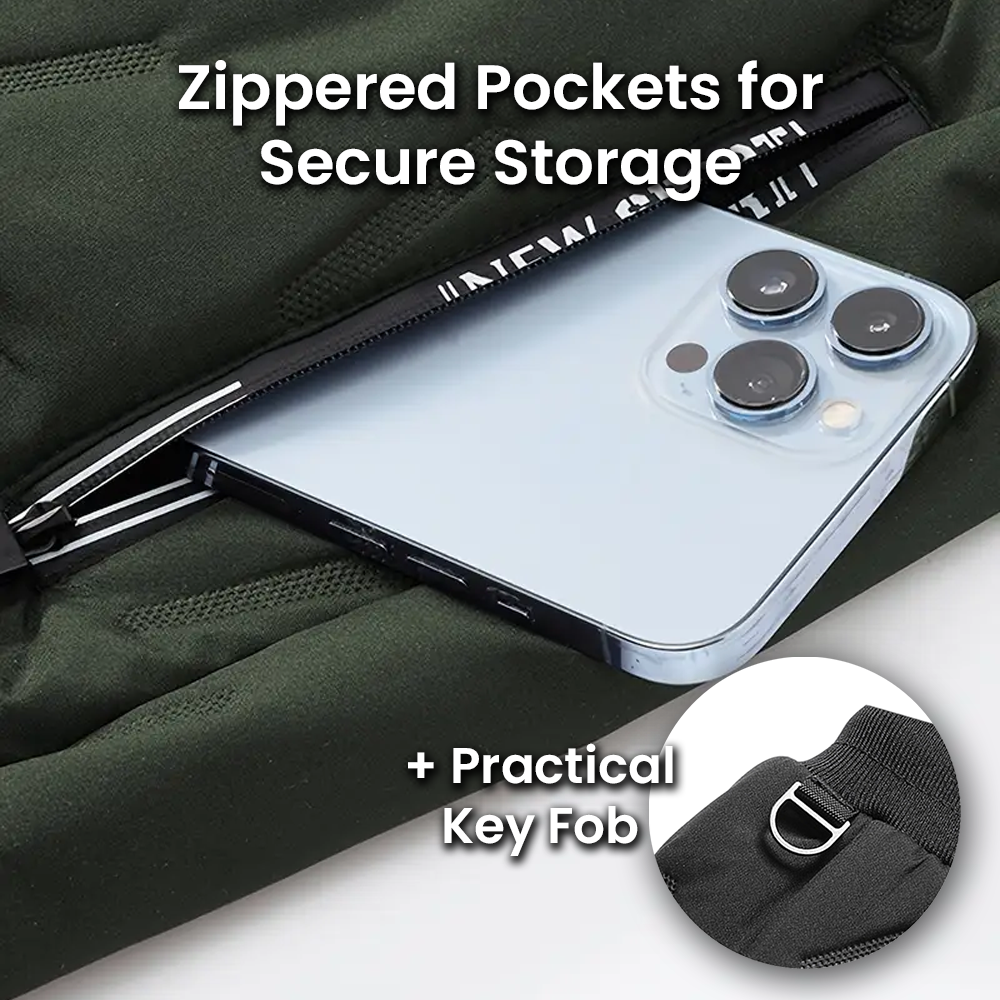 Two zippered side pockets hold your phone, keys, or wallet securely so you can stay hands-free and worry-free.